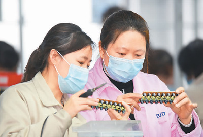 近期,湖南省郴州市嘉禾縣經(jīng)開(kāi)區(qū)園區(qū)72家制造、裝備企業(yè)全部復(fù)工復(fù)產(chǎn),產(chǎn)能迅速回升,經(jīng)濟(jì)指標(biāo)基本恢復(fù)往年同期水平。圖為該經(jīng)開(kāi)區(qū)的百俊達(dá)電子科技有限公司女工們?cè)诩庸どa(chǎn)電子配件。 |