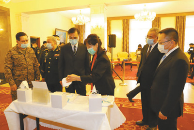 3月28日,中國政府援蒙第一批醫(yī)療物資運抵蒙古國首都烏蘭巴托。圖為中國駐蒙古國大使柴文睿(右四)和蒙方官員了解醫(yī)療用品的性能。 |