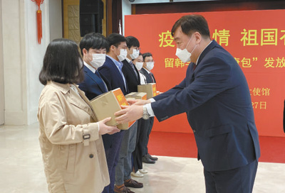 3月27日,中國駐韓國大使邢海明(右)向韓國高校中國留學(xué)生代表發(fā)放“健康包”。 |