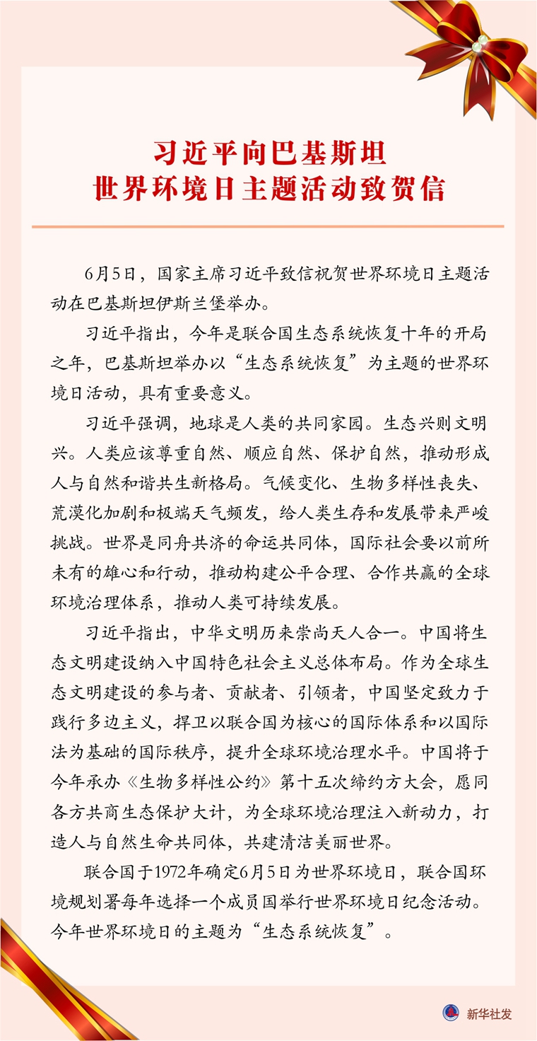 6月5日,國(guó)家主席習(xí)近平致信祝賀世界環(huán)境日主題活動(dòng)在巴基斯坦伊斯蘭堡舉辦。