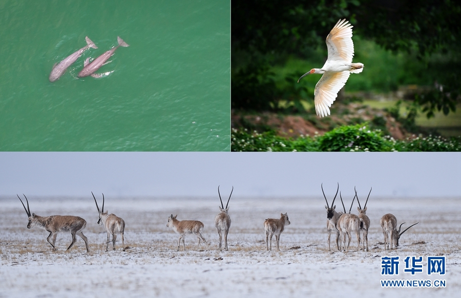 這是一張拼版照片:左上圖為在湖北省宜昌市江邊,長江江豚在水中嬉戲(無人機(jī)照片,新華社記者肖藝九5月11日攝);右上圖為陜西省漢中市洋縣朱鹮生態(tài)園內(nèi)的朱鹮(新華社記者劉瀟5月13日攝);下圖為藏羚羊在三江源可可西里地區(qū)活動(新華社記者吳剛4月20日攝)。新華社發(fā)