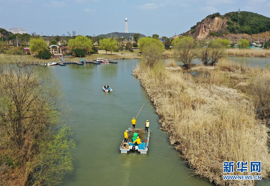 2021年2月24日,浙江湖州吳興區(qū)八里店鎮(zhèn)移沿山村河長帶隊在移沿山村開展巡河、保潔作業(yè)(無人機(jī)照片)。新華社記者 翁忻旸 攝