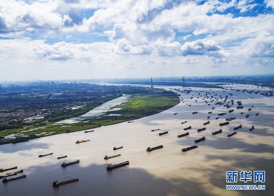 船舶在湖北省武漢市陽邏港區(qū)水域行駛(2018年8月13日攝,無人機(jī)照片)。新華社記者 肖藝九 攝