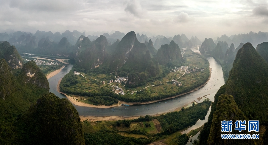 這是2018年10月18日拍攝的廣西桂林陽朔縣興坪鎮(zhèn)的漓江景色(無人機(jī)拼接照片)。新華社記者 李鑫 攝