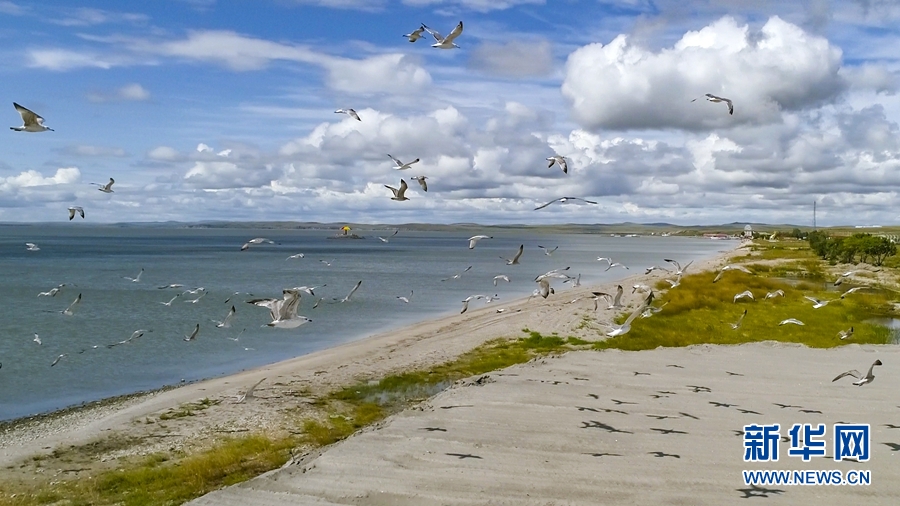 這是2019年8月28日拍攝的呼倫湖畔的水鳥(無人機(jī)照片)。新華社記者沈伯韓攝