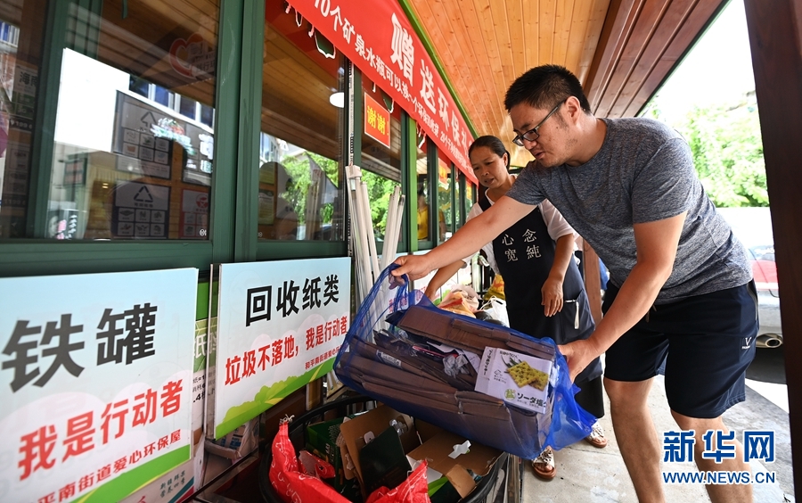 2020年8月25日,居民將生活垃圾送到??谑忻捞m區(qū)和平南街道愛心環(huán)保屋,用垃圾換取紙巾、肥皂等生活用品。新華社記者郭程攝