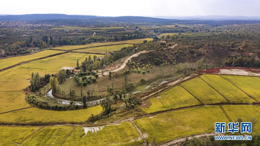 2020年9月26日拍攝的陜西省靖邊縣黃蒿界鎮(zhèn)馬季溝村稻田(無人機(jī)照片)。近年來,靖邊縣實施了“三北”防護(hù)林、退耕還林、流域治理等生態(tài)建設(shè)工程,北部沙漠區(qū)裸露明沙完全消失,中部農(nóng)田林網(wǎng)蔚然成蔭,南部山區(qū)夏季綠色滿山。新華社記者 陶明 攝