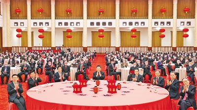 人民大會(huì)堂宴會(huì)廳張燈結(jié)彩、喜氣洋洋,各界人士歡聚一堂、共迎佳節(jié),現(xiàn)場(chǎng)洋溢著喜慶祥和的節(jié)日氣氛。