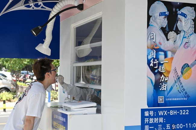 7月5日,在無錫市濱湖區(qū)蠡園街道的一處核酸采樣點,一名市民在進行核酸采樣。新華社記者 李博 攝