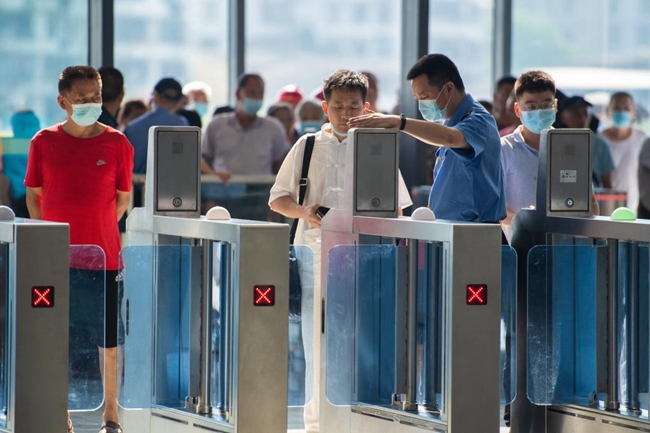 7月1日,在株洲火車站安檢區(qū),旅客進行人臉識別通過安檢。新華社記者 陳思汗 攝