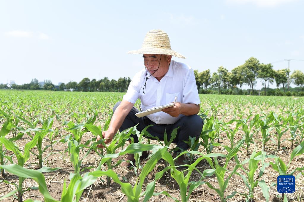在安徽省阜陽(yáng)市太和縣舊縣鎮(zhèn),徐淙祥在淙祥現(xiàn)代農(nóng)業(yè)種植專(zhuān)業(yè)合作社的高產(chǎn)攻關(guān)示范田里查看苗情(6月28日攝)。新華社記者 周牧 攝
