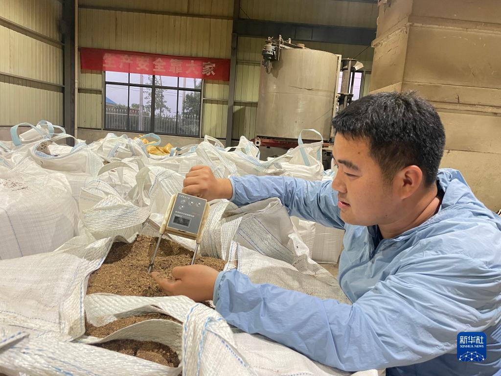 7月7日,安徽省滁州市天長(zhǎng)市種糧大戶平東林在秸稈炭化廠房用水分測(cè)定儀檢測(cè)秸稈炭粉水分指標(biāo)。新華社發(fā)(朱禮明 攝)