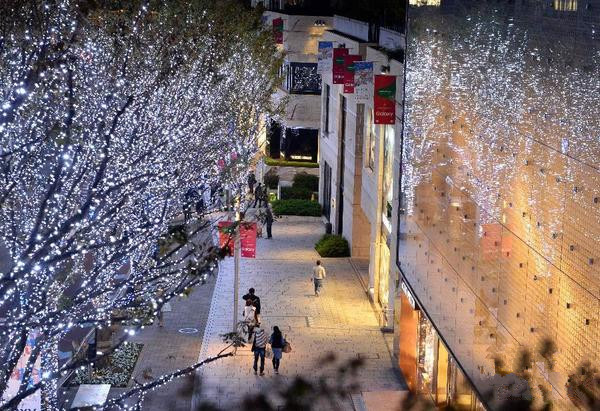 11月4日,在日本東京六本木櫸坂大街,人們在LED燈泡點綴的樹木下走過。當(dāng)日,日本東京著名的六本木櫸坂大街舉辦了亮燈式,120萬個LED燈泡點綴在街道兩旁的樹枝間,猶如天上繁星入人間,給深秋寒意漸濃的東京增添了幾分浪漫。新華社記者馬平攝