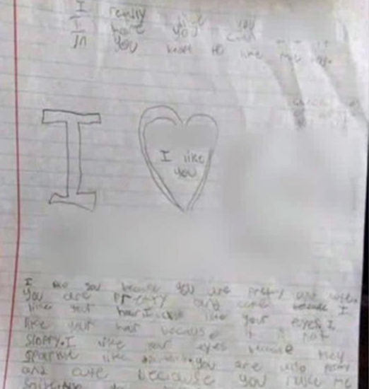 報(bào)道稱,這名男童在情書中寫道:“我喜歡你,我喜歡你整齊不蓬松的頭發(fā),我喜歡你閃亮如鉆石的雙眼”,并在情書中畫了一個(gè)愛心。