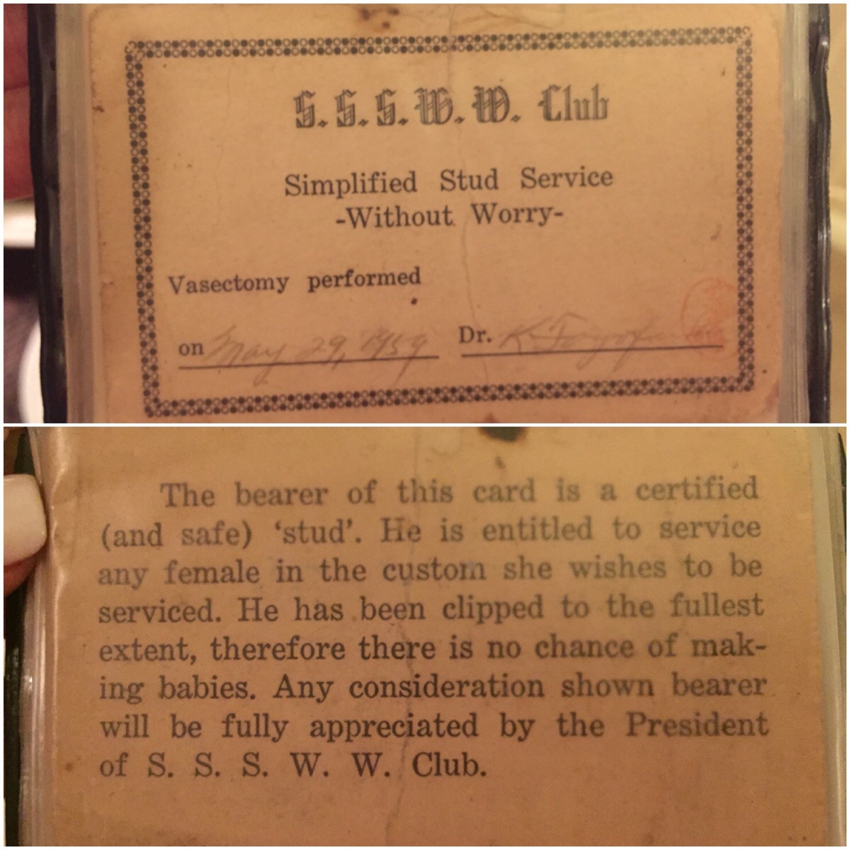 在已經(jīng)泛黃的紙張上,寫(xiě)有其祖父的簽名和落款日期1959年5月29日。證書(shū)內(nèi)容寫(xiě)道:持證者可以安心做“男妓”,并且可以接待任何女性客戶,因?yàn)楸唤Y(jié)扎,所以不用擔(dān)心會(huì)導(dǎo)致顧客懷孕。持卡人如有疑問(wèn),俱樂(lè)部都將熱心處理。