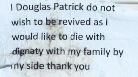 當(dāng)?shù)栏窭顾歪t(yī)急救時(shí),杰奎琳寫了一封假的放棄求救書。“我,道格拉斯希望能在家人的陪伴下有"尊嚴(yán)"的死去,在瀕死時(shí)決定不施行心肺復(fù)蘇術(shù)。”杰奎琳誤將dignity (尊嚴(yán)) 寫成了“dignaty” ,后來警察要求她拼出這個(gè)字時(shí),她仍然拼錯(cuò),讓警方成功揪出凱瑟琳就是背后的嫌犯。