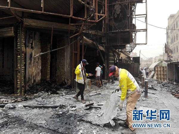 7月3日,在伊拉克首都巴格達(dá)卡拉達(dá)區(qū),工作人員清理爆炸現(xiàn)場(chǎng)。新華社發(fā)(哈利勒·達(dá)烏德攝)