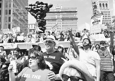 另一位示威參與者、配音師尼科爾·哈德澤在接受本報(bào)記者采訪時(shí)說(shuō):“坦白說(shuō)我沒有中意的候選人。民主黨和共和黨都深受利益集團(tuán)的影響,本質(zhì)上是利益交換。很多媒體看到他們的差異,我認(rèn)為他們的政策都是雷同的,不能帶來(lái)真正的改變。不能指望兩黨的既得利益者出臺(tái)有力的改革措施。”