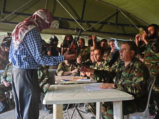 5月4日,哈馬市附近,一名敘利亞前反對(duì)派武裝人員將武器上繳給由敘利亞代表和俄羅斯軍人組成的委員會(huì)。(圖片來源:新華/法新)