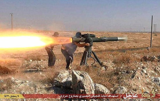 2015年6月26日上傳互聯(lián)網(wǎng)的照片顯示“伊斯蘭國(guó)”武裝人員在敘利亞北部的戰(zhàn)斗中向目標(biāo)發(fā)射反坦克導(dǎo)彈。(圖片來源:新華/美聯(lián))
