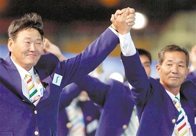 ●兩國代表團(tuán)各派一名運動員舉“朝鮮半島旗”,以“朝鮮半島”的名義共同入場