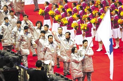 這是2007年1月28日,朝鮮和韓國代表團(tuán)在吉林省長春市舉行的第六屆亞洲冬季運動會開幕式上攜手入場