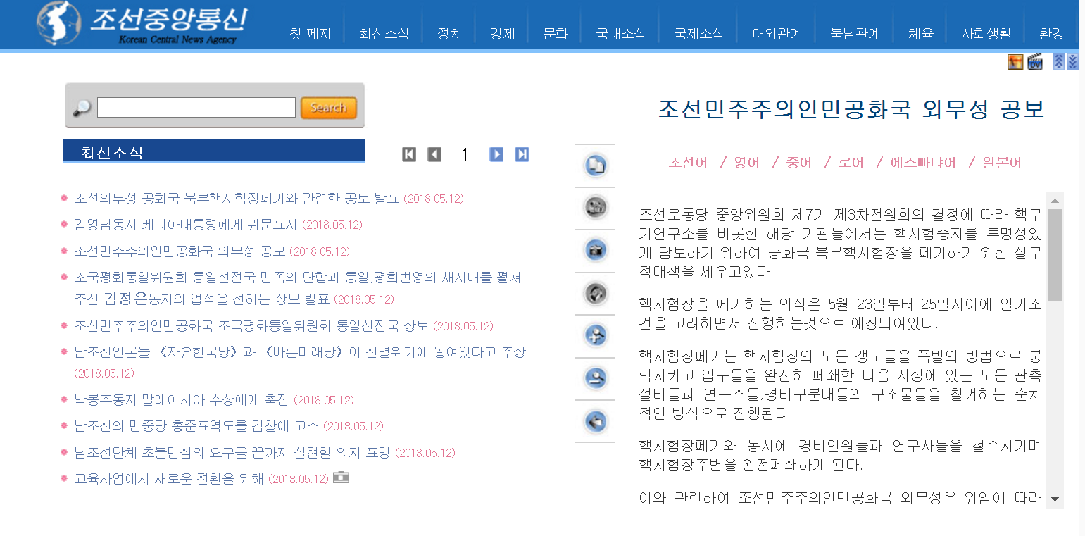 根據(jù)朝鮮勞動黨第七屆中央委員會第三次全會決議,核武器研究所等有關(guān)機構(gòu)為透明地保障核試驗停止,正在采取廢棄朝鮮北部核試驗場的業(yè)務(wù)措施。