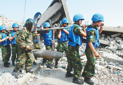 中國維和部隊官兵在黎巴嫩南部轉(zhuǎn)移未爆航彈。 |