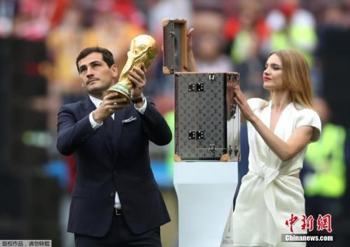 西班牙傳奇門將卡西利亞斯與俄羅斯名模沃迪奧諾娃共同將象征著世界足壇最高榮耀的大力神杯帶入場內(nèi)。