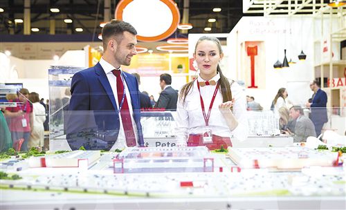 在俄羅斯圣彼得堡國際經(jīng)濟(jì)論壇展覽上,俄羅斯莫斯科州展臺的工作人員為與會者講解。新華社記者 吳 壯攝