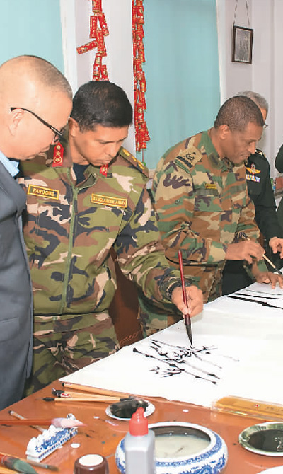 在國際防務(wù)學(xué)院一間書畫室的墻上,貼著外軍學(xué)員及其家屬寫下的書法作品:“友誼”“兄弟情”“和平”“繁榮”……這些漢字表達(dá)了他們對中國的感情、對和平的向往。