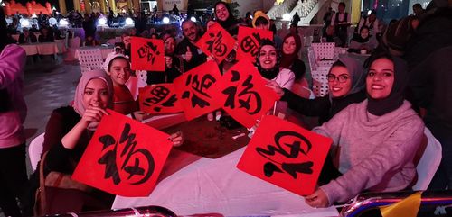 在埃及,參與春節(jié)廟會(huì)活動(dòng)的當(dāng)?shù)孛癖娬故居芍袊鴷視鴮懞笏统龅?ldquo;福”字。人民日報(bào)記者 周 輖攝