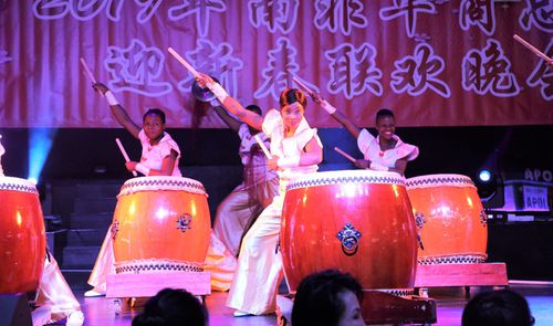 1月26日晚,南非華商總會(huì)迎新春聯(lián)歡晚會(huì)在約翰內(nèi)斯堡舉行。圖為由當(dāng)?shù)匮莩鋈藛T表演的開場鼓樂。人民日報(bào)記者 呂 強(qiáng)攝