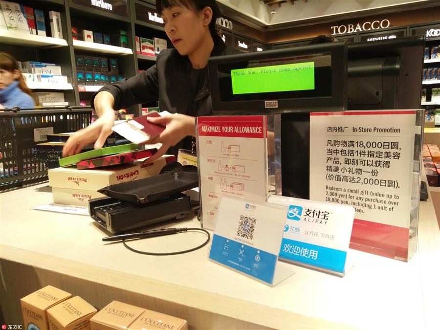 當(dāng)?shù)貢r(shí)間2018年1月22日,日本沖繩,機(jī)場(chǎng)免稅店在顯著位置放置接受支付寶支付發(fā)標(biāo)識(shí)。(圖片來(lái)源:東方IC)