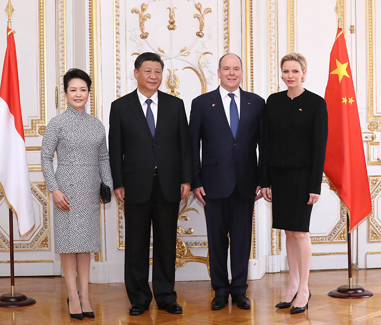 3月24日,國家主席習近平同摩納哥親王阿爾貝二世舉行會談。這是習近平和夫人彭麗媛同阿爾貝二世親王夫婦合影。 新華社記者鞠鵬攝