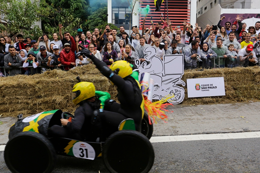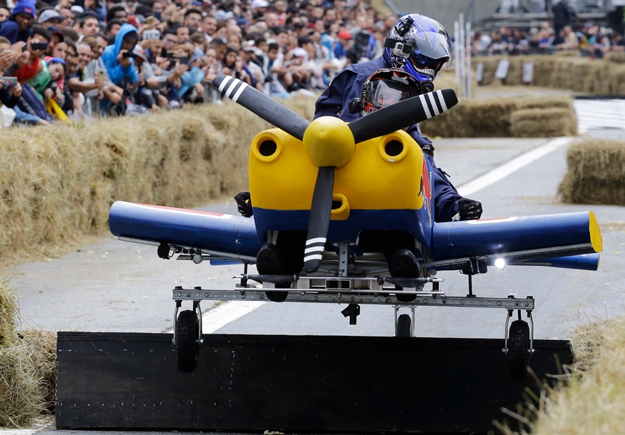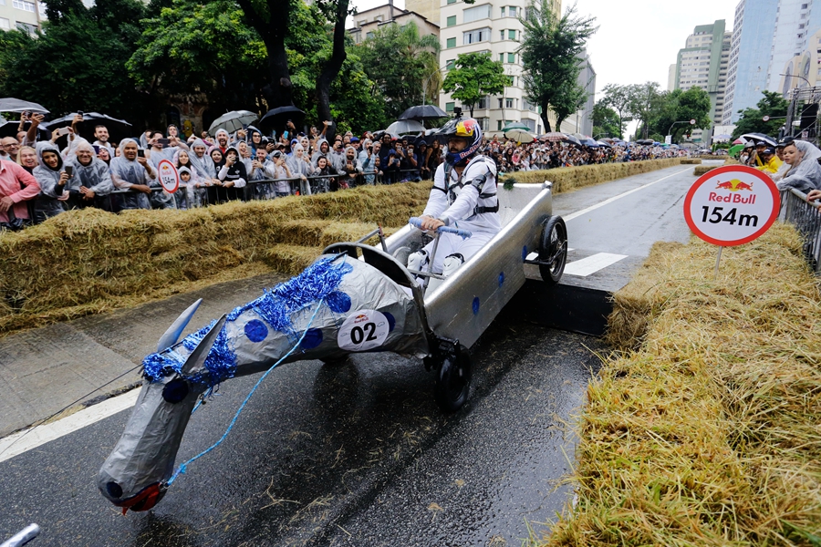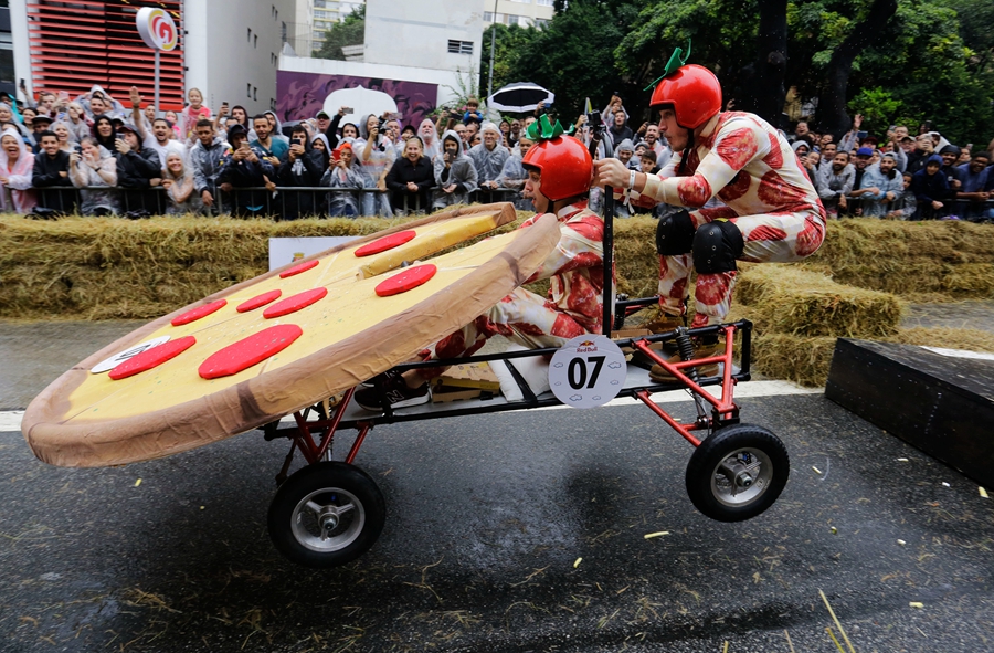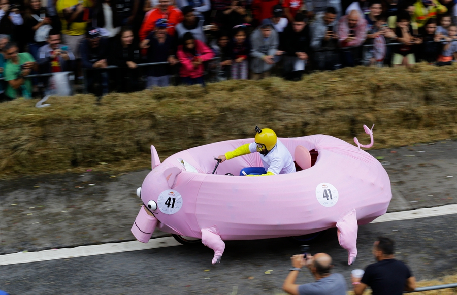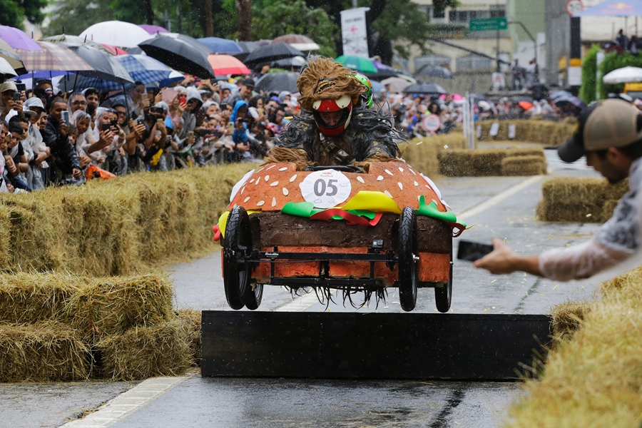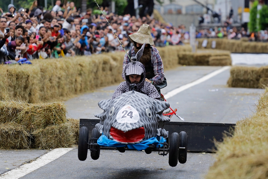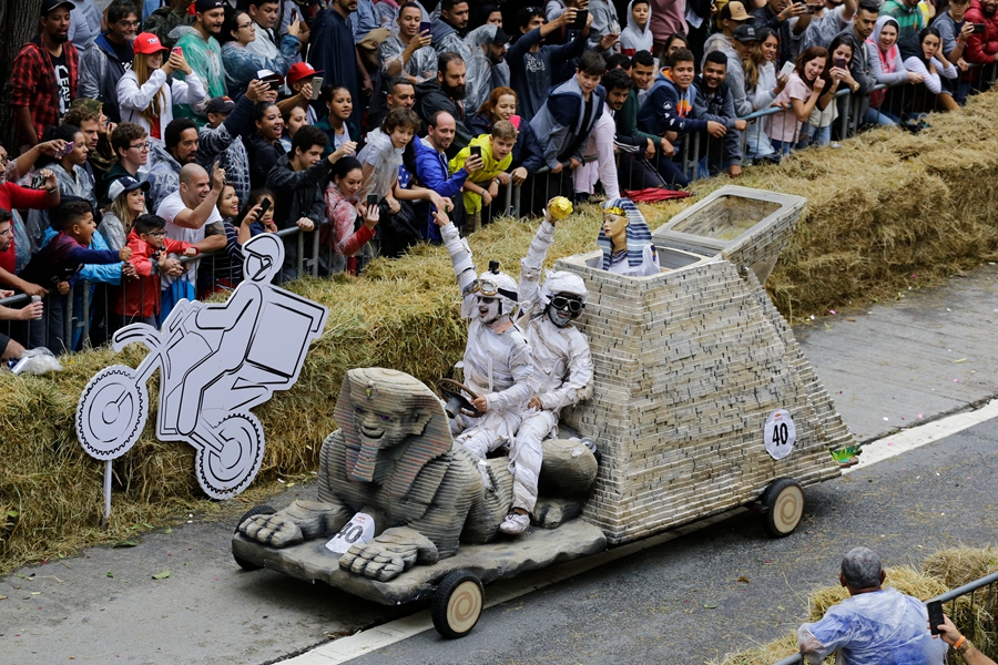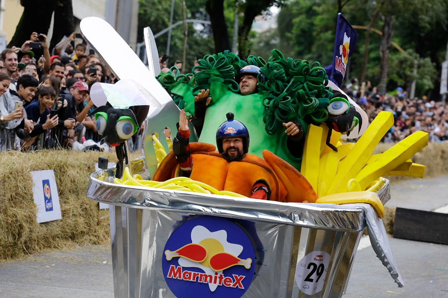 當(dāng)?shù)貢r(shí)間2019年4月14日,巴西圣保羅,當(dāng)?shù)嘏e辦紅牛肥皂盒汽車(chē)大賽,參賽者將車(chē)子打扮成各種奇怪的造型,在沒(méi)有動(dòng)力的情形下滑下下坡道,參加比賽。