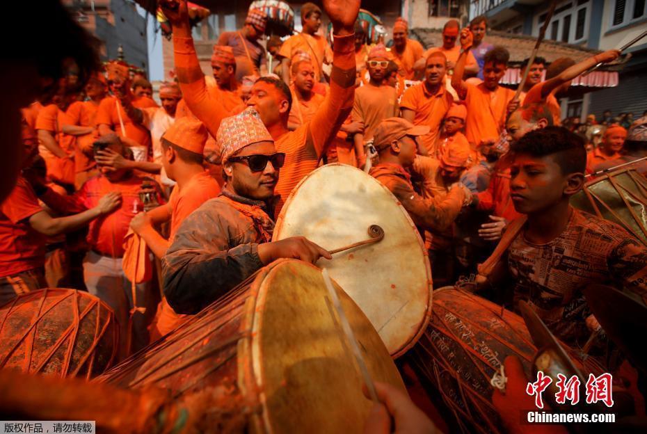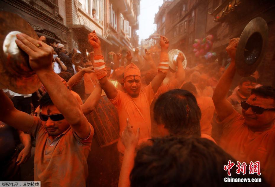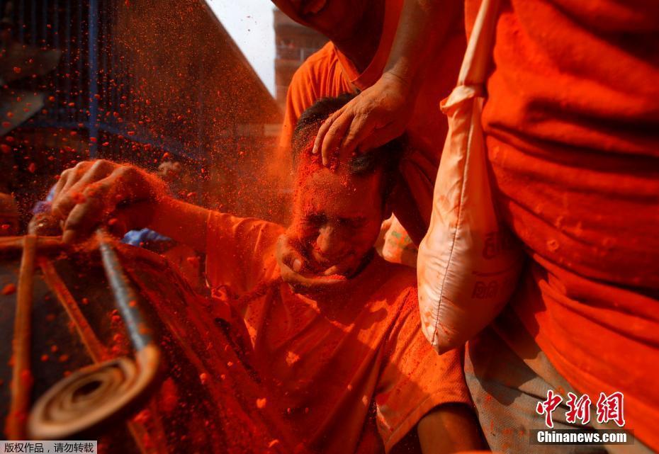 當(dāng)?shù)貢r間4月15日,尼泊爾巴克塔普爾,人們互相拋撒朱砂粉,慶祝朱砂節(jié)(Sindoor festival )以及尼泊爾新年。