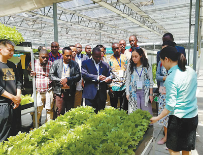 農(nóng)科院國家農(nóng)業(yè)科技創(chuàng)新園負(fù)責(zé)人給非洲青年科技人員講解蔬菜無土栽培技術(shù)。 |