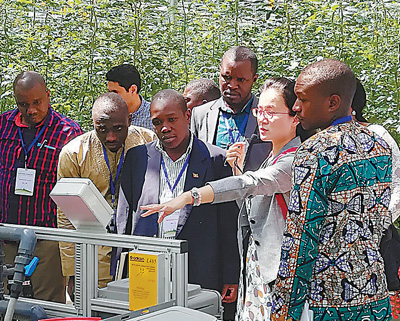 非洲青年科技人員饒有興致地了解無土栽培智能營養(yǎng)液循環(huán)控制系統(tǒng)。 |