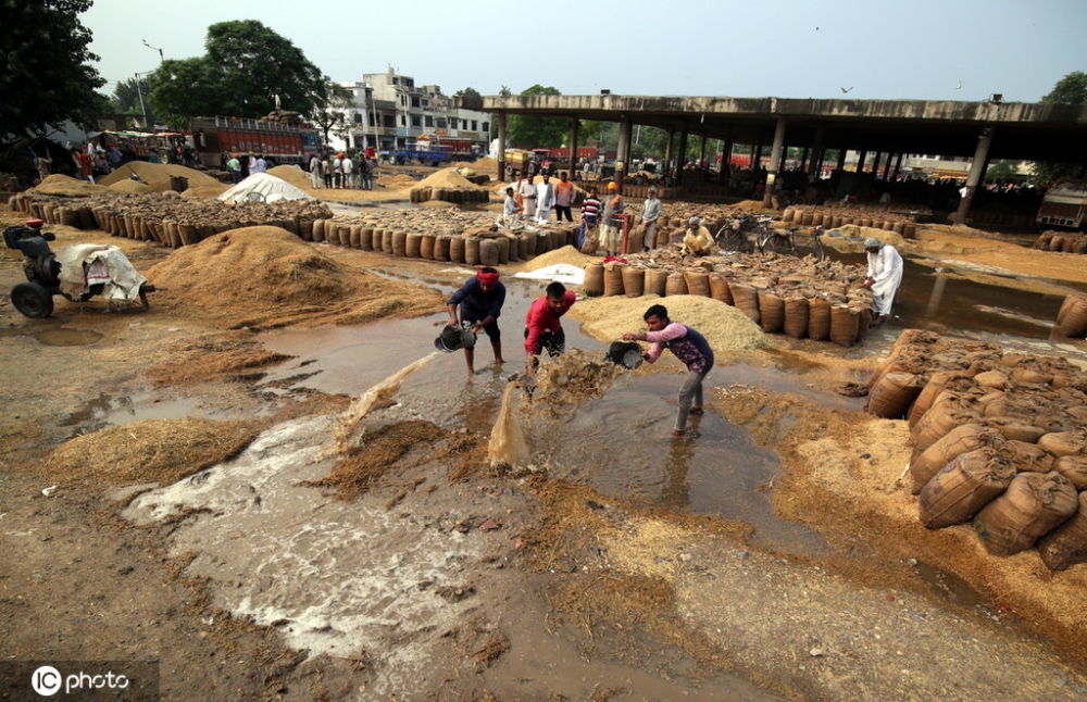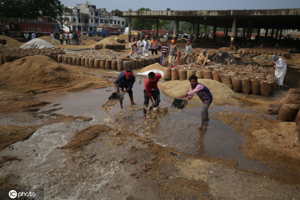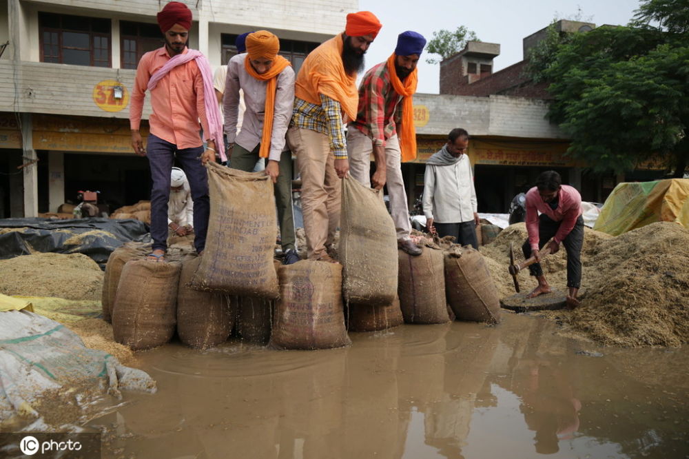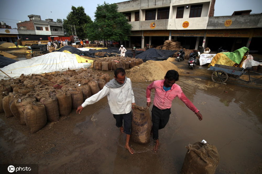摘要:當(dāng)?shù)貢r(shí)間2019年9月27日,印度阿姆利則,一場(chǎng)大雨過后,印度工人糧食谷物市場(chǎng)的積水。受持續(xù)暴雨影響,當(dāng)?shù)匦率斋@的水稻被浸泡腐壞,農(nóng)民對(duì)...