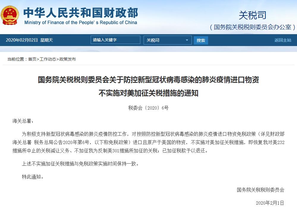 據(jù)國務院關稅稅則委員會網(wǎng)站消息,為積極支持新型冠狀病毒感染的肺炎疫情防控工作,對按照防控新型冠狀病毒感染的肺炎疫情進口物資免稅政策進口且原產(chǎn)于美國的物資,不實施對美加征關稅措施,即恢復我對美232措施所中止的關稅減讓義務、不加征我為反制美301措施所加征的關稅;已加征稅款予以退還。
