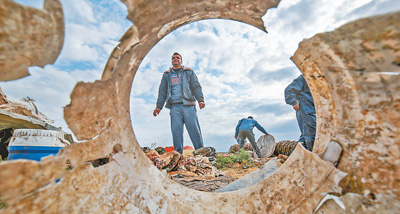 2月25日,在加沙地帶,幾名巴勒斯坦男子在遭以色列空襲的地點(diǎn)拾取個(gè)人物品。 |