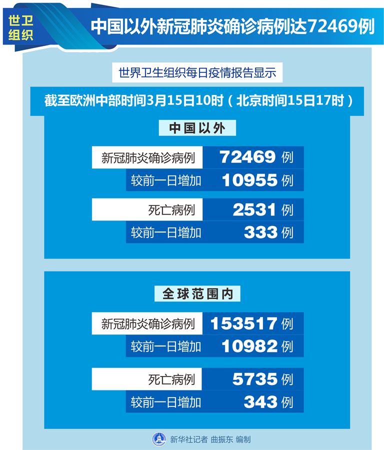 世衛(wèi)組織每日疫情報告顯示,截至歐洲中部時間15日10時(北京時間15日17時),中國以外新冠肺炎確診病例較前一日增加10955例,達到72469例;中國以外死亡病例較前一日增加333例,達到2531例。