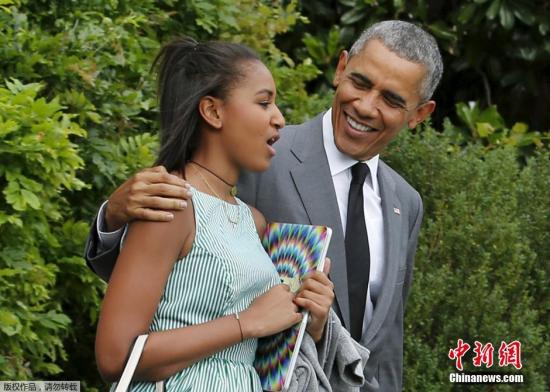 圖為奧巴馬與女兒薩莎。當(dāng)?shù)貢r(shí)間2015年7月17日,奧巴馬與女兒薩莎及其兩位朋友登上海軍陸戰(zhàn)隊(duì)一號(hào)前往紐約度周末。