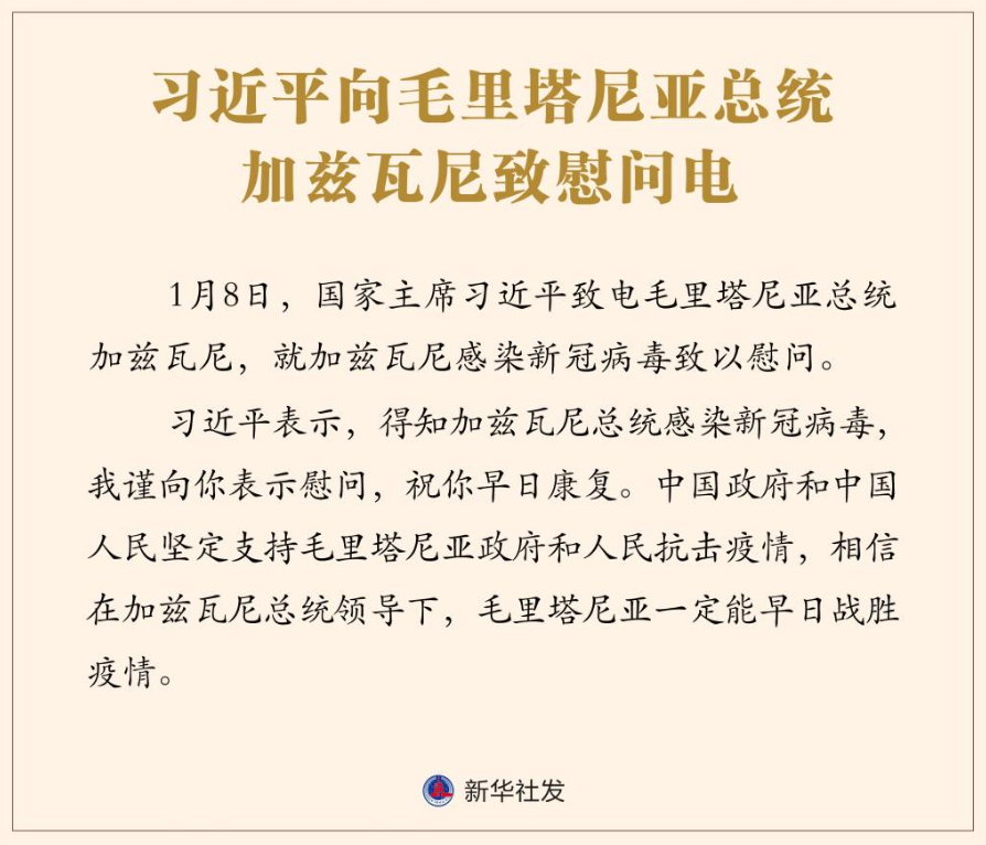 習(xí)近平表示,得知加茲瓦尼總統(tǒng)感染新冠病毒,我謹(jǐn)向你表示慰問,祝你早日康復(fù)。中國(guó)政府和中國(guó)人民堅(jiān)定支持毛里塔尼亞政府和人民抗擊疫情,相信在加茲瓦尼總統(tǒng)領(lǐng)導(dǎo)下,毛里塔尼亞一定能早日戰(zhàn)勝疫情。