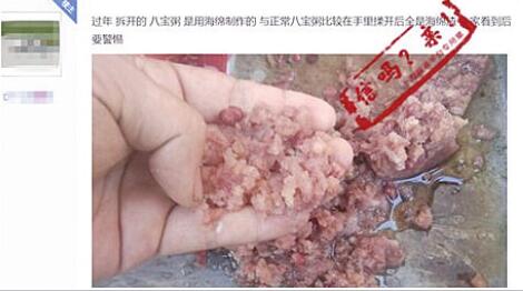 2月,一則“用海綿做八寶粥”的視頻在網(wǎng)上傳播。一名男子將某品牌的罐裝八寶粥倒在盤子里,先倒出一些清澈的液體,后來(lái)倒出的粥體則凝固成果凍狀。