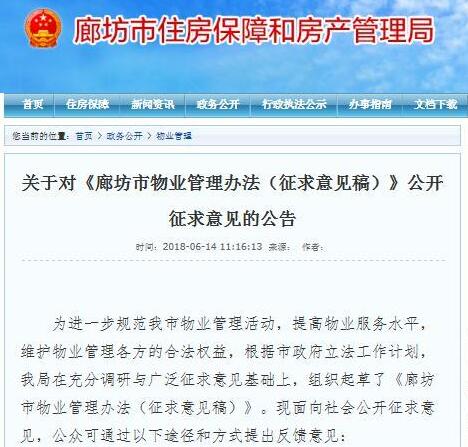 近日,廊坊市住房保障和房產(chǎn)管理局發(fā)布了關(guān)于對(duì)《廊坊市物業(yè)管理辦法(征求意見稿)》公開征求意見的公告,以下是公告全文: