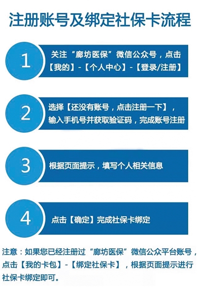 注意:如果您已經(jīng)注冊過“廊坊醫(yī)保”微信公眾平臺賬號,點(diǎn)擊【我的卡包】—【綁定社??ā浚鶕?jù)頁面提示進(jìn)行社??ń壎纯?。