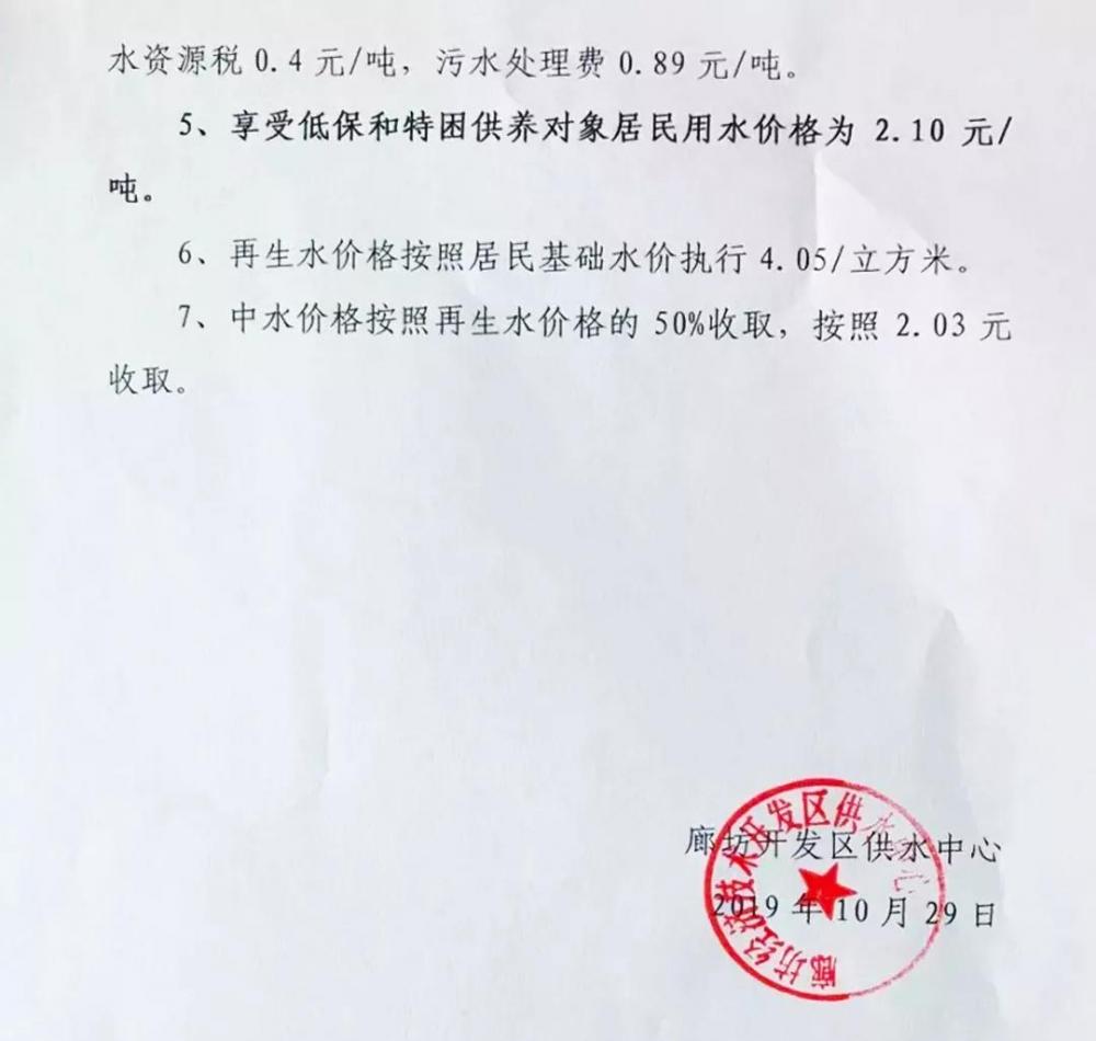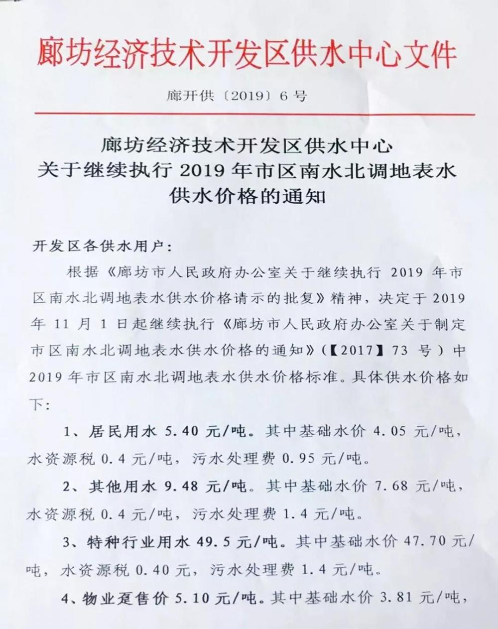 根據(jù)《廊坊市人民政府辦公室關(guān)于繼續(xù)執(zhí)行2019年市區(qū)南水北調(diào)地表水供水價格請示的批復(fù)》精神,決定于2019年11月1日起繼續(xù)執(zhí)行《廊坊市人民政府辦公室關(guān)于制定市區(qū)南水北調(diào)地表水供水價格的通知》(〔2017〕73號)中2019年市區(qū)南水北調(diào)地表水供水價格標(biāo)準(zhǔn)。