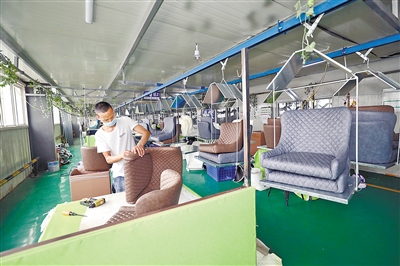 圖為工作人員正在沙發(fā)車間加緊生產(chǎn)。 記者 賈珺 攝